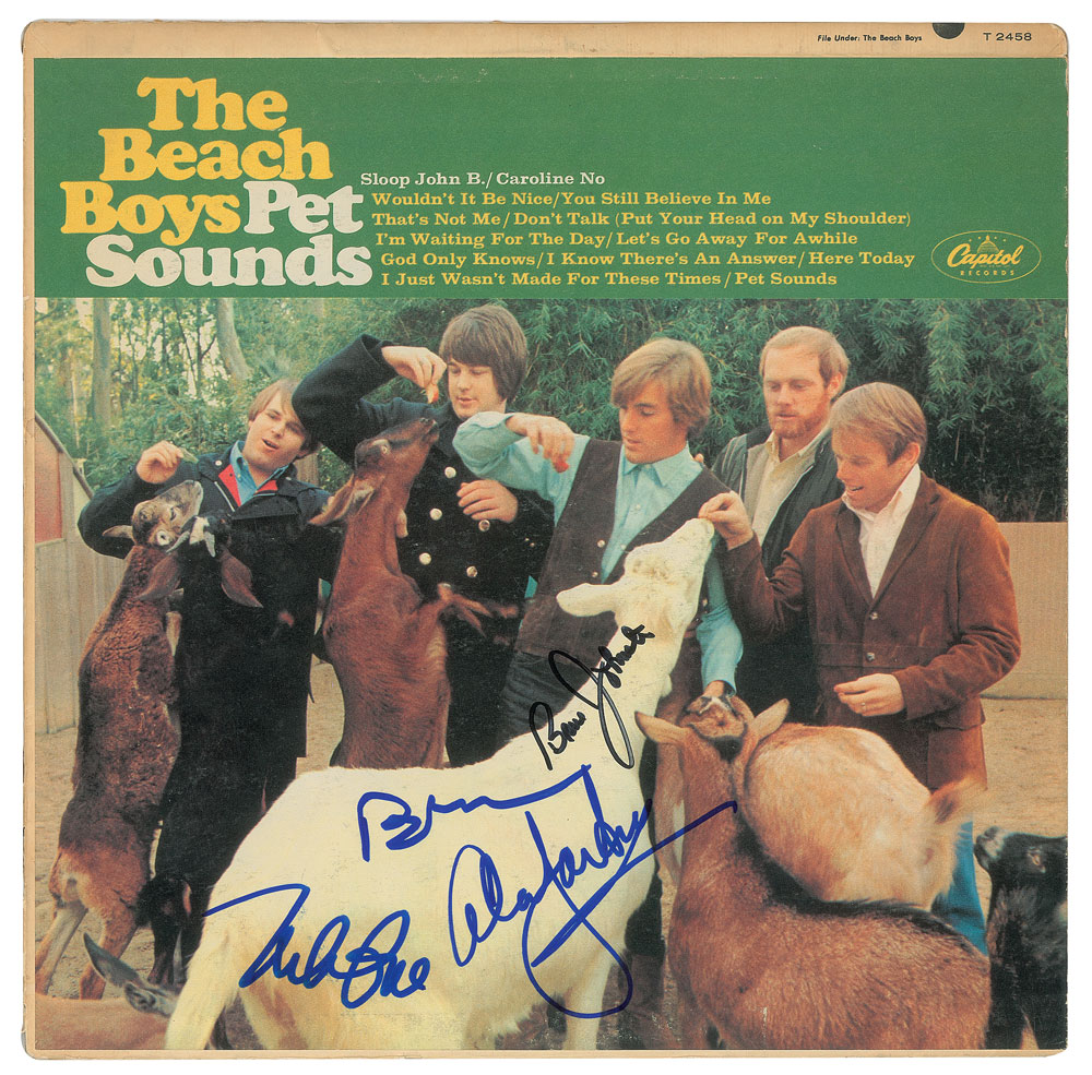Pet Sounds album signed on the front cover in blue felt tip by Brian Wilson, Mike Love, and Al Jardine, and in black felt tip by Bruce Johnston. In very good to fine condition, with partial spine separation. The record is included. From The John Brennan In-person Autograph Collection.