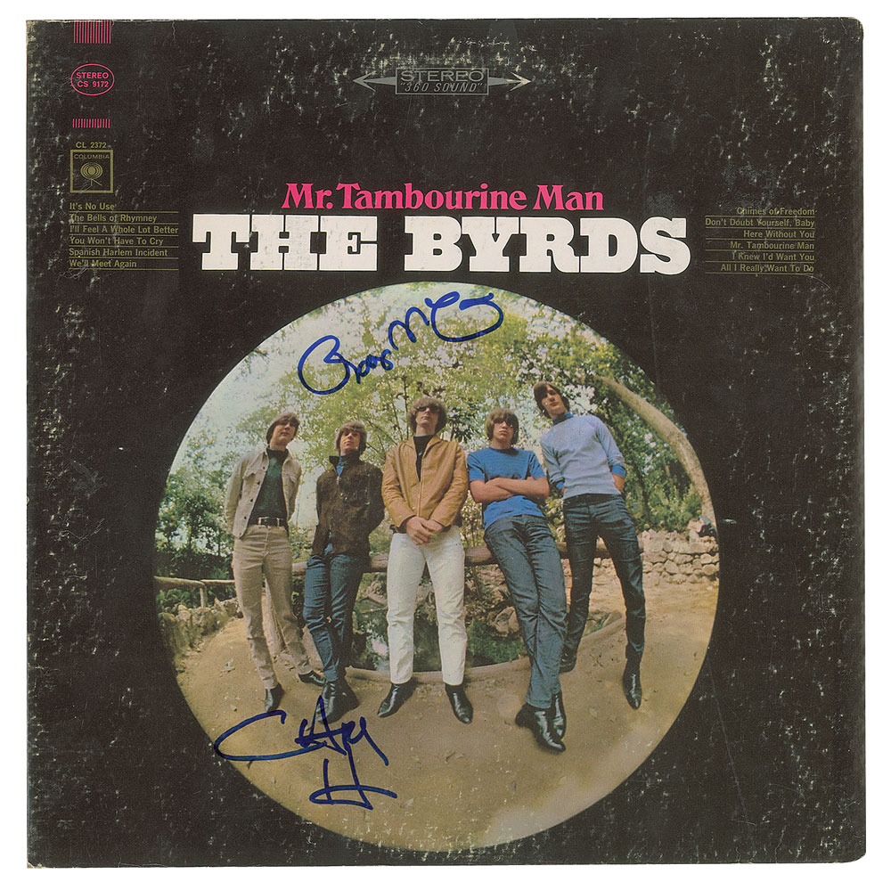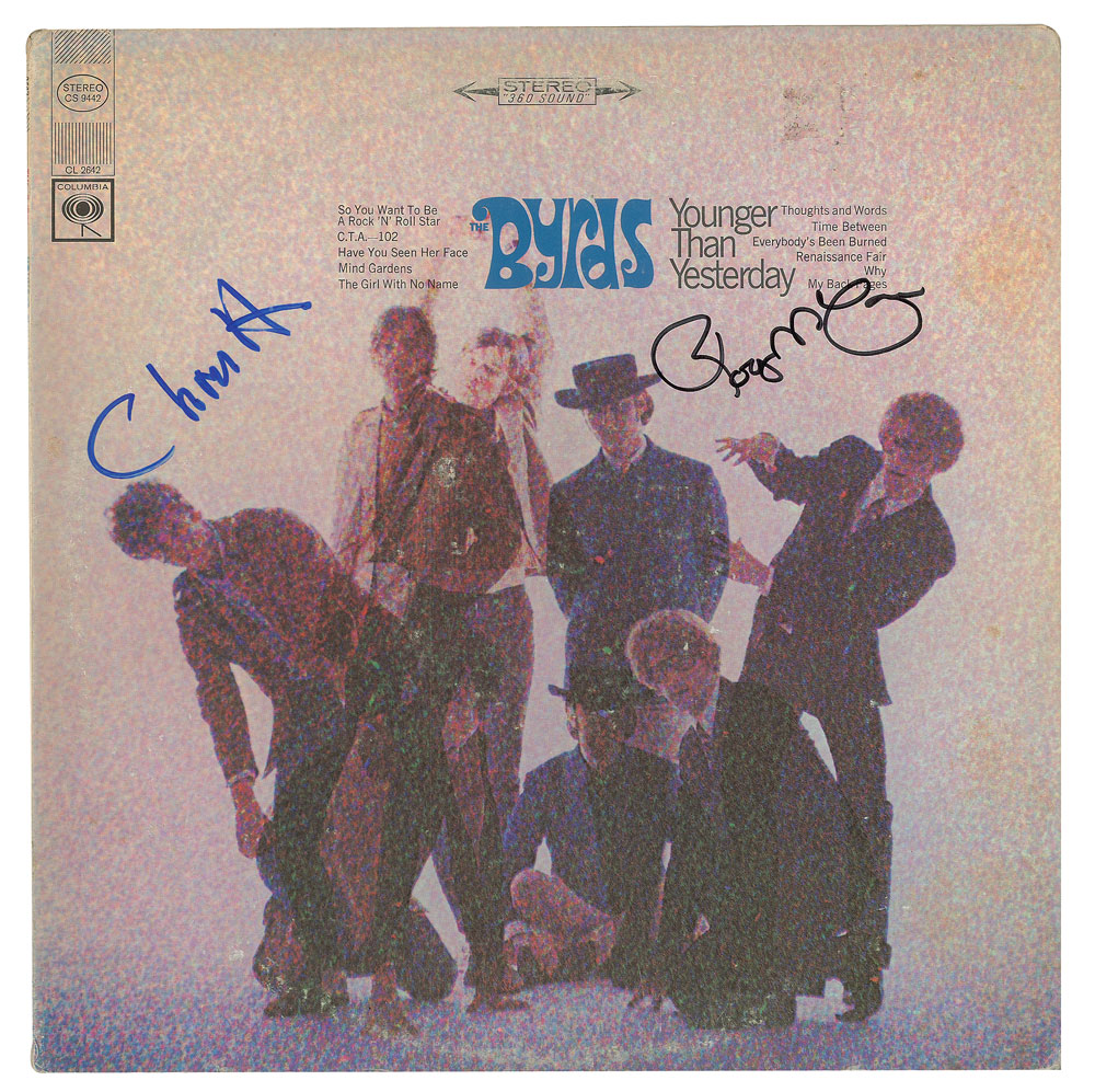 Two albums by The Byrds—Mr. Tambourine Man and Younger Than Yesterday—both signed on the front cover in felt tip by Roger McGuinn and Chris Hillman. In overall very good to fine condition, with light scuffing and old price sticker residue. The records are included. From The John Brennan In-person Autograph Collection.