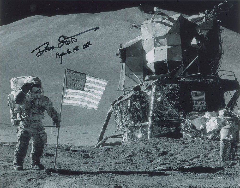 Glossy 10 x 8 photo of Dave Scott saluting the American flag on the lunar surface during the Apollo 15 mission, signed in black felt tip, "Dave Scott, Apollo 15 CDR." In fine condition.