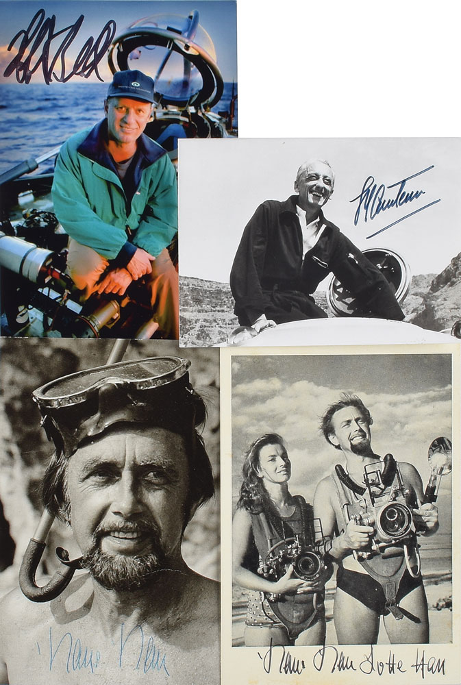 Four photos signed in ink or felt tip by a noted maritime pioneer, ranging in size from 4.75 x 3.5 to 4 x 6, each signed by the pictured explorer, including: Jacques Cousteau, Hans Hass (2), and Robert Ballard. In overall fine condition.