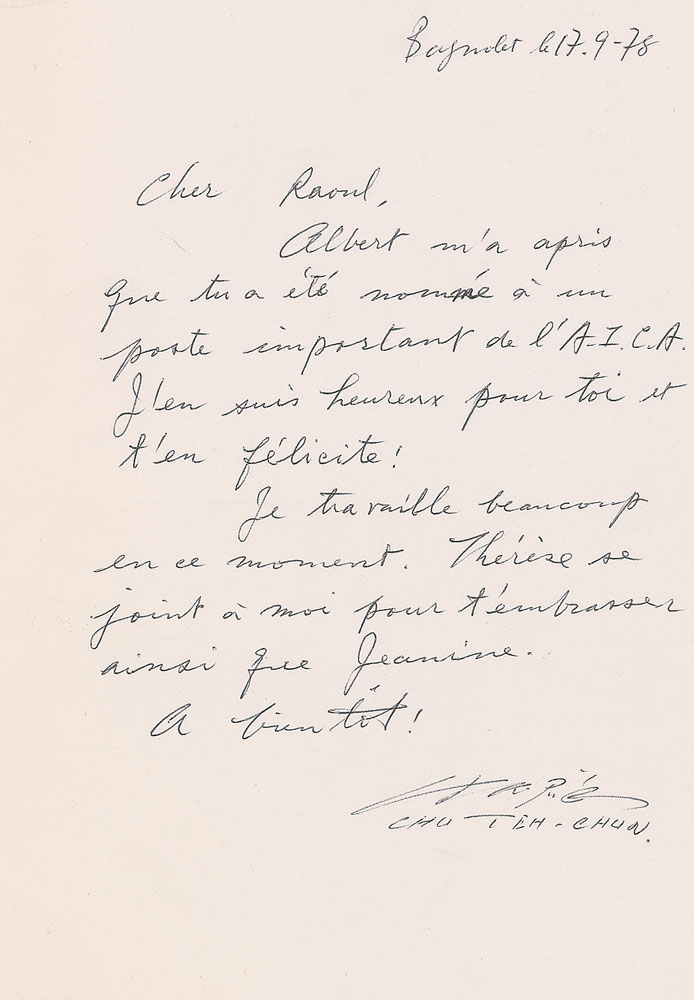 Chinese-French abstract painter (1920-2014) known for his pioneering style integrating traditional Chinese painting techniques with Western abstract art. Scarce ALS in French, one page, 5.75 x 8.25, September 17, 1978. Letter to Raoul, in full (translated): "Albert told me that you have been appointed to an important position of A.I.C.A. I am happy for you and congratulate you! I laughed a lot right now. Therese joins me to kiss you and Jeanine." In fine condition, with creasing to the lower left corner, and a diagonal crease passing above the signature.