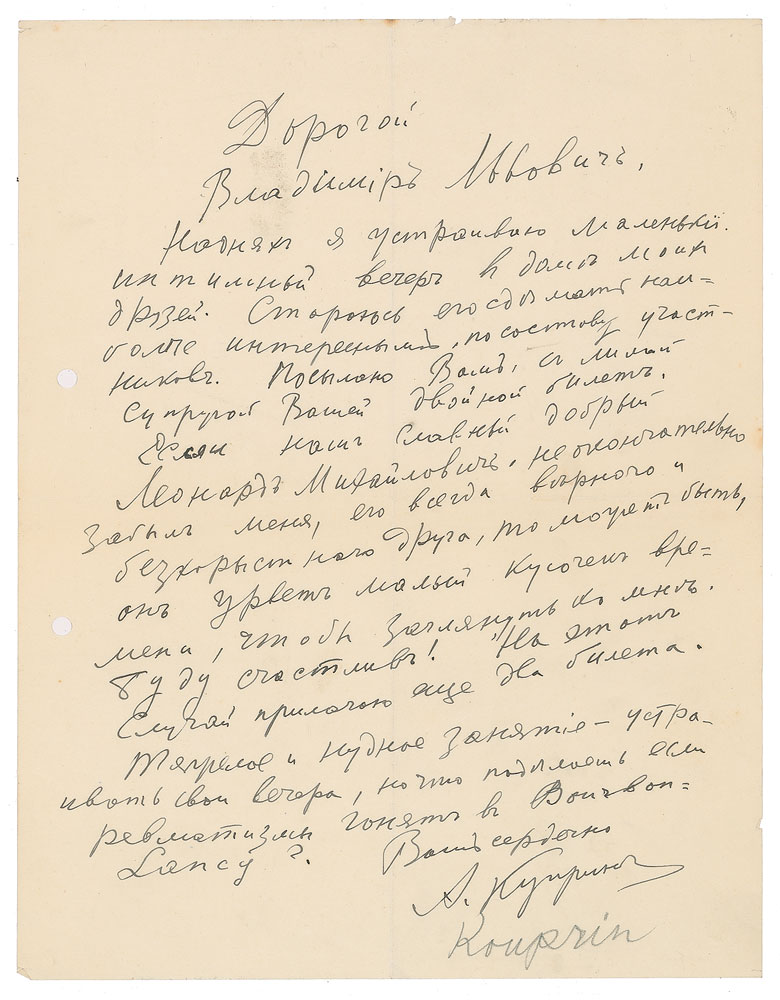 Russian writer, explorer, and adventurer (1870-1938) best known for his story The Duel. Untranslated ALS in Cyrillic, signed “A. Kyuprin,” one page, 8.25 x 10.5, no date. In fine condition, with two file holes to the left side.