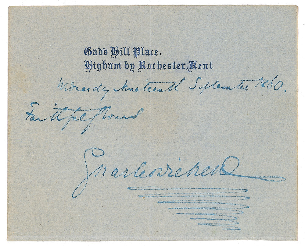 Very desirable ink signature, "Wednesday Nineteenth September 1860, Faithfully yours, Charles Dickens,” on an off-white 4.5 x 3.5 sheet of Gads Hill Place letterhead. In fine condition, with a central vertical fold. Roughly two-and-a-half months later on December first, Great Expectations was published as a serial in Dickens's weekly periodical All the Year Round.