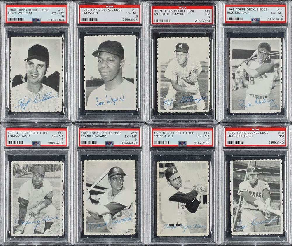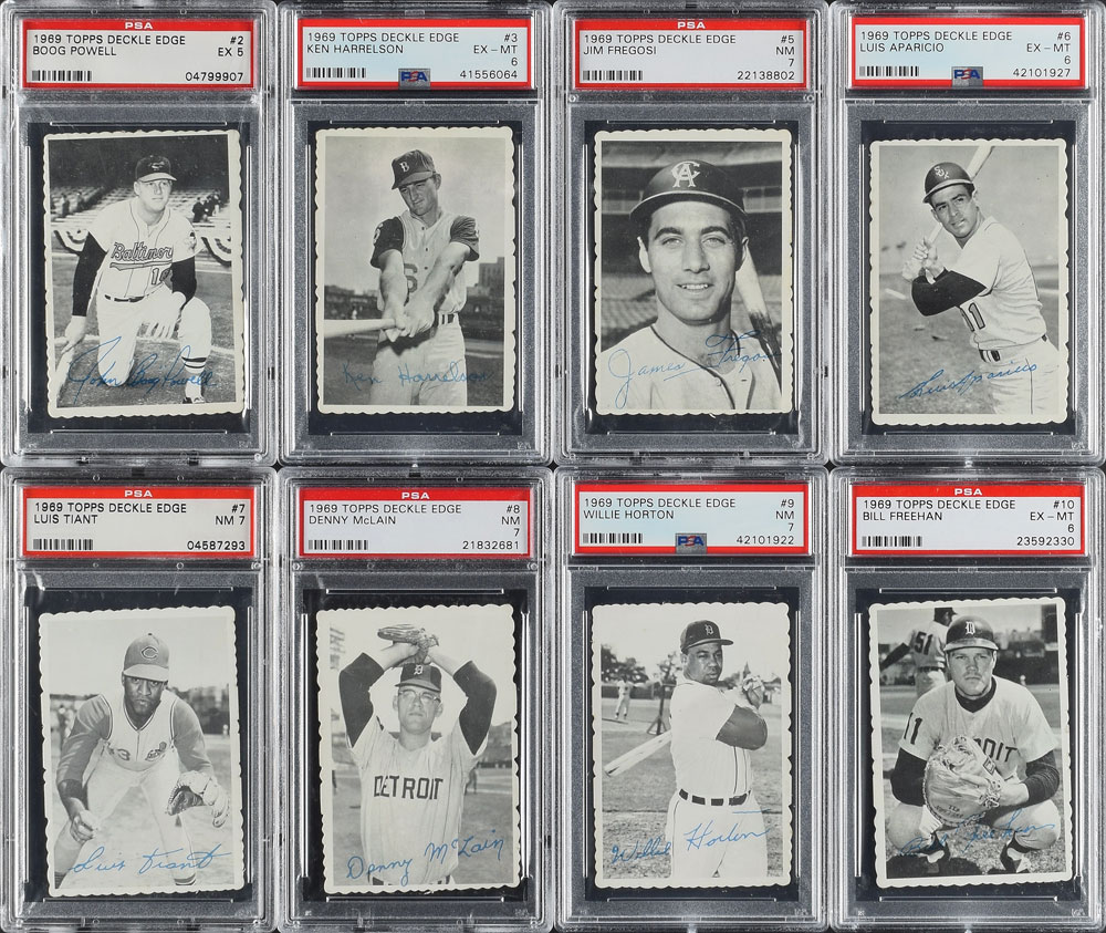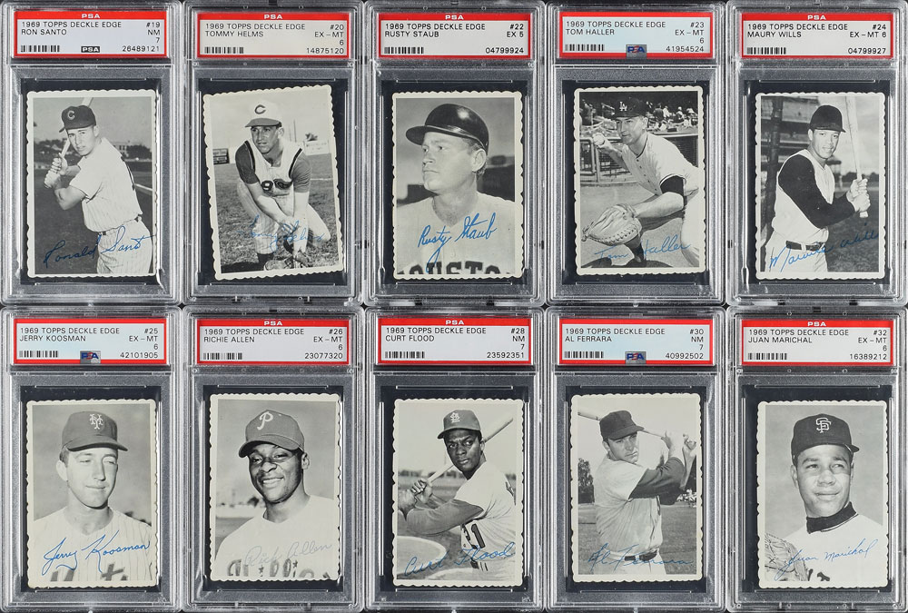 Offered is a complete PSA Graded set of the 1969 Topps Deckle Edge cards, one of the most difficult Topps insert sets to find in high grade. This set includes 35 cards, with the 33 issued numbers and the variations of cards 11 and 22. There are no cards lesser than an EX 5, and the GPA would be approximately 6.547, which would rank 12th of the Current Finest sets.