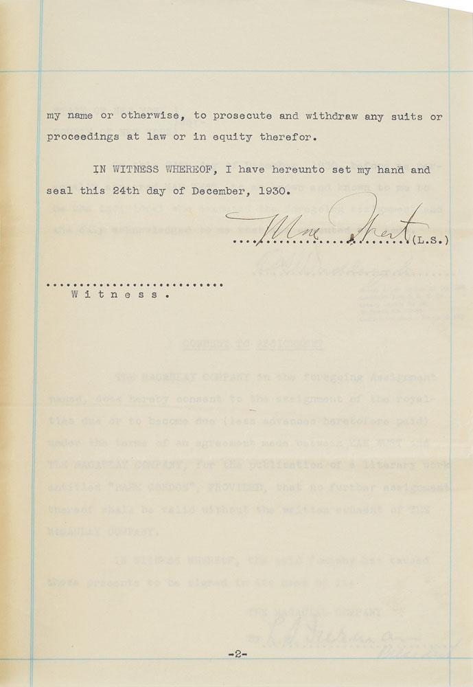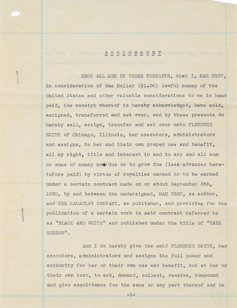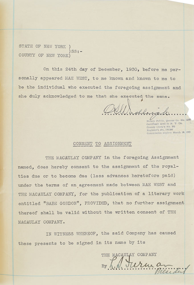 DS, two pages, 8 x 10.5, December 24, 1930. Assignment issued to Florence Smith for all "right, title and interest in and to any and all sum or sums of money…by virtue of royalties earned or to be earned…by Mae West, as author, and The Macaulay Company, as publisher…for the publication of a certain work in said contract referred to as 'Black and White' and published under the title of 'Babe Gordon.'" Signed on the second page in black ink by West. Attached is a notarized rider regarding the 'Consent to Assignment.' In fine condition.