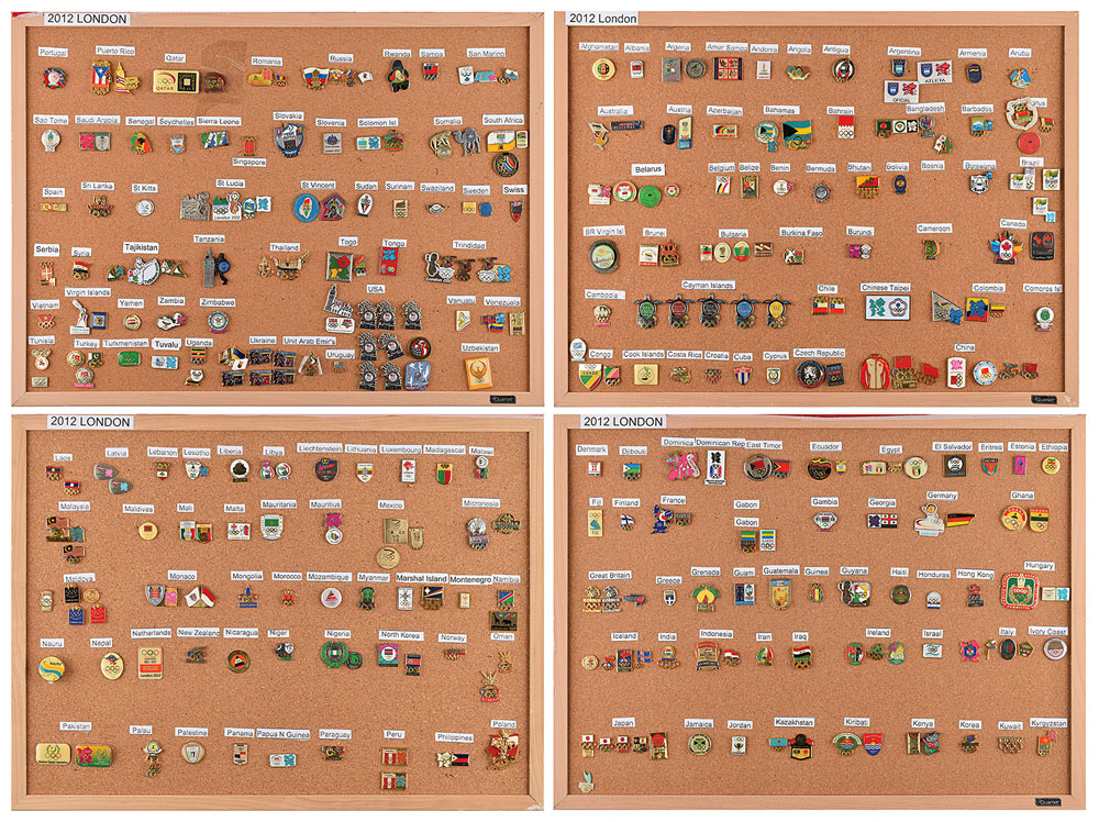 Huge collection of 325 National Olympic Committee (NOC) and other pins issued for the London 2012 Summer Olympics, the majority of which are enameled, ranging in size from .5 x .5 to 1.5 x 1.5. The pins in the collection represent nearly 200 different nations that participated in the historic Games. The pins are displayed on four 23 x 17 corkboards. In overall fine condition.