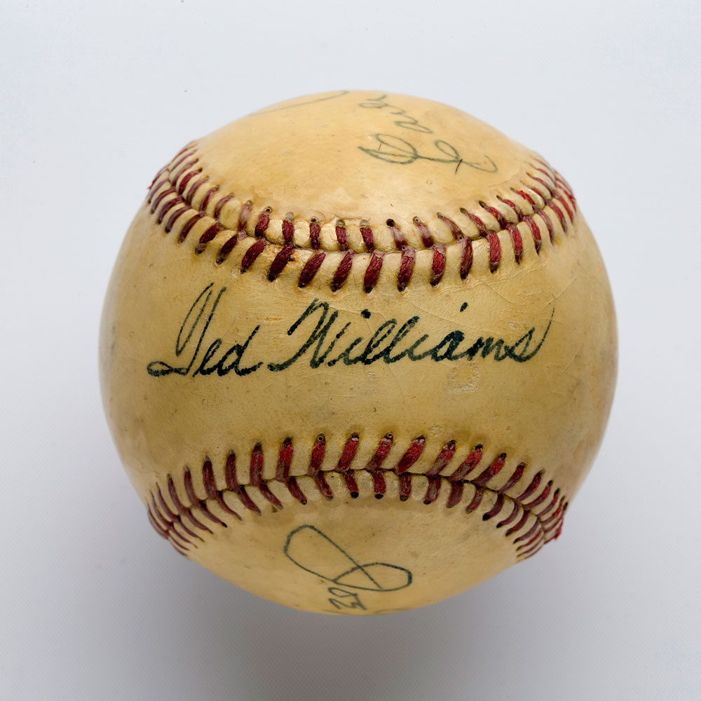 Official Reach American League (Harridge) baseball signed in fountain pen on the sweet spot by Ted Williams and on a side panel by Earle Combs; also bears a clubhouse signature of Joe McCarthy. In very good to fine condition, with overall toning to the heavy coating of shellac.