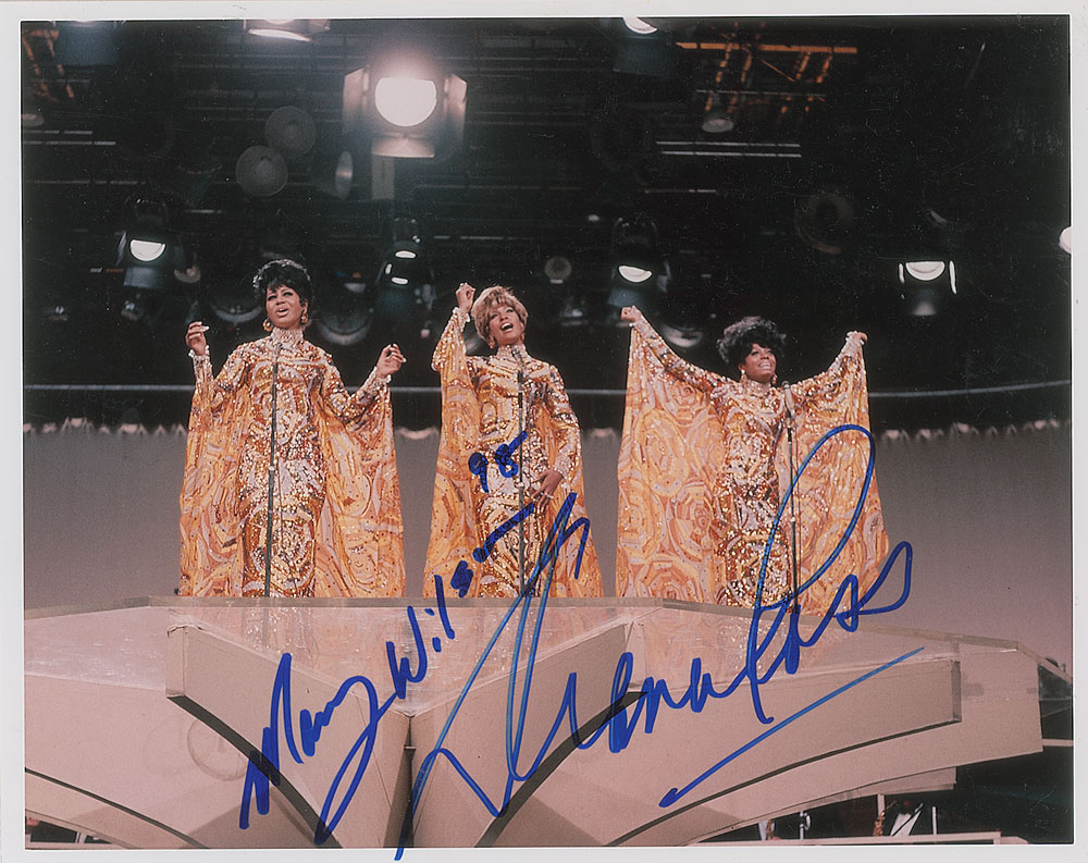Color glossy 10 x 8 photo of the Supremes performing in flashy golden outfits atop a raised platform, signed in blue felt tip, "Mary Wilson, 98" and "Diana Ross." In fine condition. From The John Brennan In-person Autograph Collection.