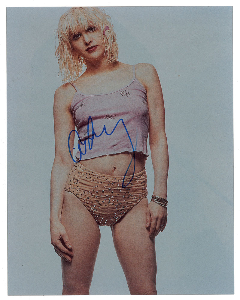 Color glossy 11 x 14 photo of the scantily dressed frontwoman for the band Hole, signed in blue felt tip, "Courtney." In very good to fine condition, with moderate creasing to the upper right background area. From The John Brennan In-person Autograph Collection.