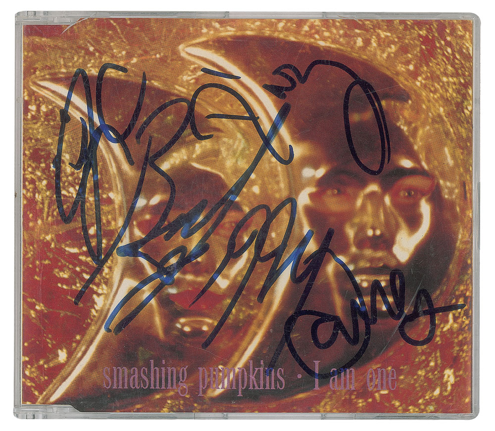 'I Am One' CD single by the Smashing Pumpkins, signed on the front cover in blue felt tip, "Billy, 1994," "D'arcy," "JC," and "James." In fine condition. The CD is included. From The John Brennan In-person Autograph Collection.