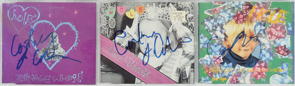 Three CD singles by Hole—'Beautiful Son,' 'Miss World,' and 'Teenage Whore'—each signed on the front cover in blue felt tip by Courtney Love, who signs either "Courtney" and "Courtney Love Cobain." In overall fine condition. The CDs are included. From The John Brennan In-person Autograph Collection.