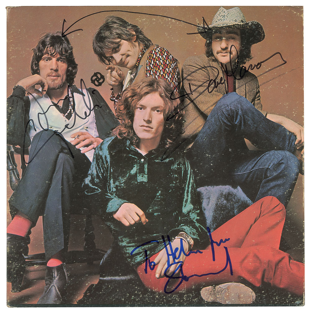 Self-titled second album from Traffic, signed on the front cover in black felt tip by Dave Mason and Jim Capaldi, and in blue felt tip by Steve Winwood, who adds an inscription "To Helen." In very good to fine condition, with light scuffing, and some old tape on the top edge of the back cover. The record is included. From The John Brennan In-person Autograph Collection.