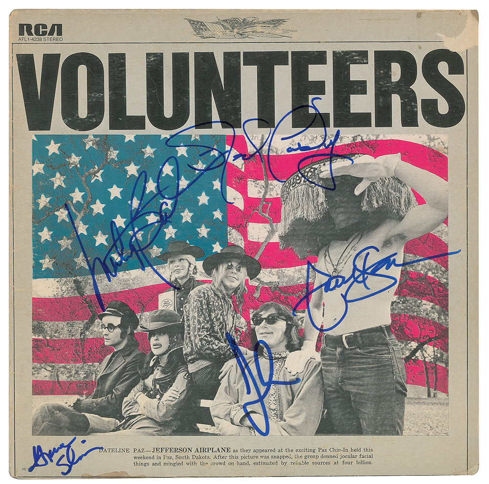 Volunteers album signed on the front cover in blue felt tip by Grace Slick, Paul Kantner, Marty Balin, Jorma Kaukonen, and Jack Casady. In very good to fine condition, with a stain to the lower edge, and some surface loss to the upper right corner. The record is included. From The John Brennan In-person Autograph Collection.