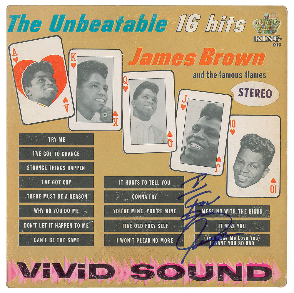 The Unbeatable James Brown and the Famous Flames album signed on the front cover in blue felt tip, "I Feel Good, James Brown." In fine condition, with a discount hole to the upper right corner. The record is included. From The John Brennan In-person Autograph Collection.