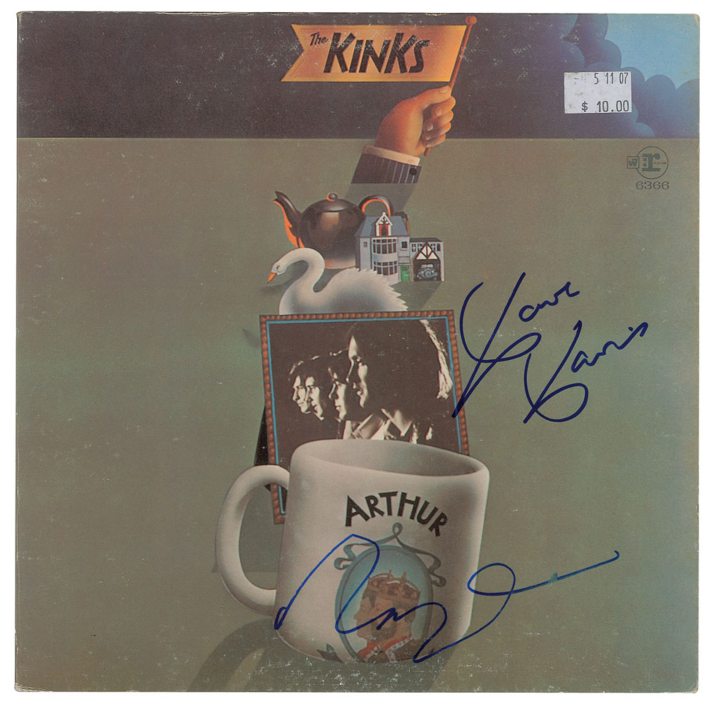Two albums by the Kinks—Arthur (Or the Decline and Fall of the British Empire) and Face to Face—both signed on the front cover in blue felt tip by Ray and Dave Davies. In overall fine condition, with light scuffing, and an affixed price sticker to Arthur. The records are included. From The John Brennan In-person Autograph Collection.