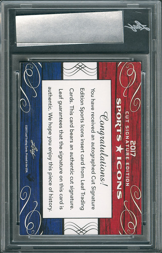 One of the most beautiful of all baseball autographs, Ted Williams, is perfectly placed in this 1 of 2 example of the 2017 Leaf Sports Icons signature card. This bold, blue Sharpie signature contrasts nicely with the light background rendering this signature as a MINT condition example. One of two produced by Leaf, a rare and highly desirable Ted Williams signed card. Pre-certified PSA/DNA.
