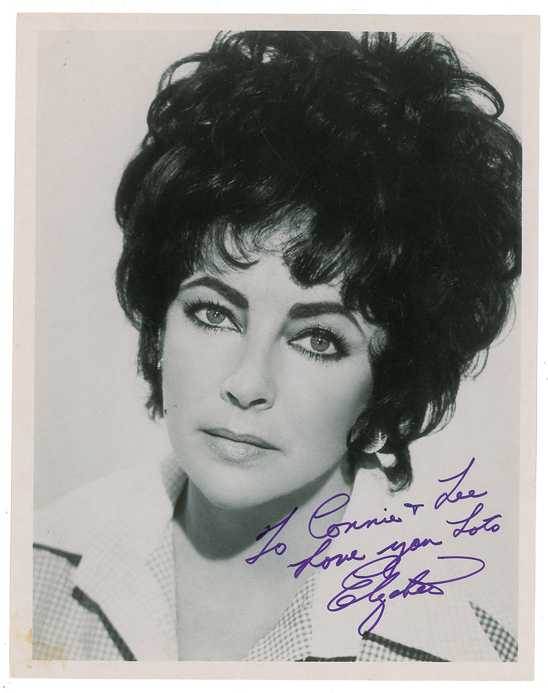 Glossy 8 x 10 close-up shot of the Hollywood icon, signed and inscribed in purple felt tip, "To Connie & Lee, Love you lots, Elizabeth.” In fine condition, with staining to the lower left corner.
