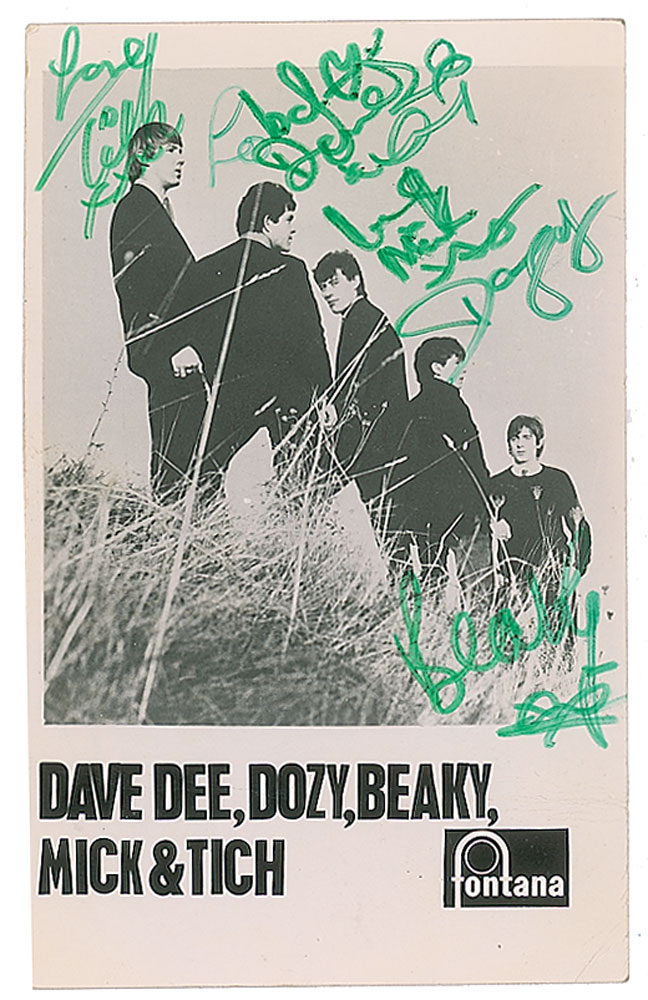 British pop/rock group of the 1960s best known for their single 'The Legend of Xanadu.' Original vintage 3.5 x 5.5 Fontana Records promotional card of Dave Dee, Dozy, Beaky, Mick and Tich, signed in green felt tip by David John Harman (Dave Dee), Trevor Leonard Ward-Davies (Dozy), John Dymond (Beaky), Michael Wilson (Mick) and Ian Frederick Stephen Amey (Tich). In fine condition. Consignor notes that the autographs were obtained by Brian Bradbury, the treasurer at the Kayser Bonder Club in Baldock, Hertfordshire, England in the 1960s. Accompanied by a letter of provenance from Bradbury and a certificate of authenticity from Tracks.