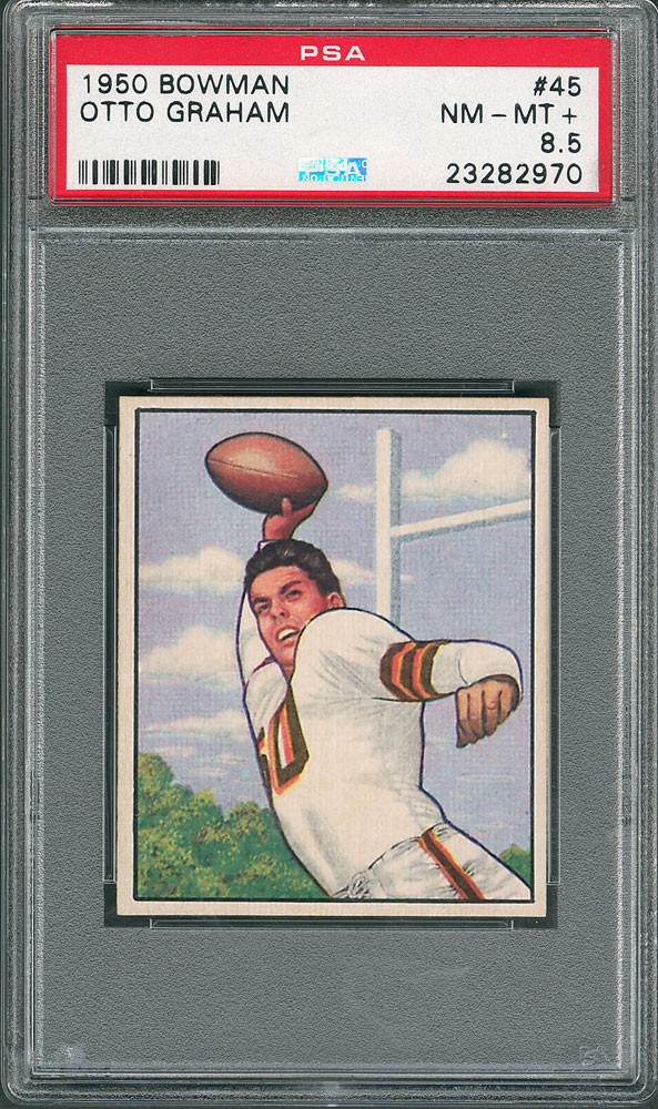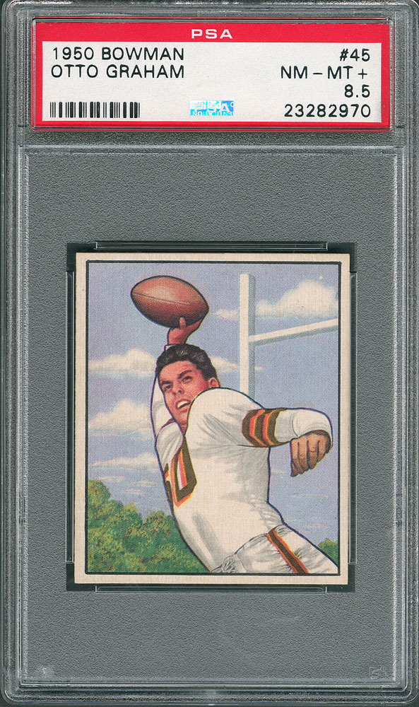 Graded by PSA NM-MT+ 8.5. One of the premiere early football cards is the rookie card of Hall of Famer Otto Graham, one of the best quarterbacks of the 1940s/50s. He was such a masterful field general that in every season Graham quarterbacked the Browns, first in the AAFC, then in the NFL, he led the Browns to league title games every season, winning all four AAFC championships from 1946 through 1949, and three NFL titles in the 1950s. Graham's first card was issued after the Browns merged into the NFL, and is a beauty in every respect. Sharp corners, brilliant color, and a crisp image highlight this example. Clean surfaces to front and back, this card would not look out of place in a MINT 9 holder.