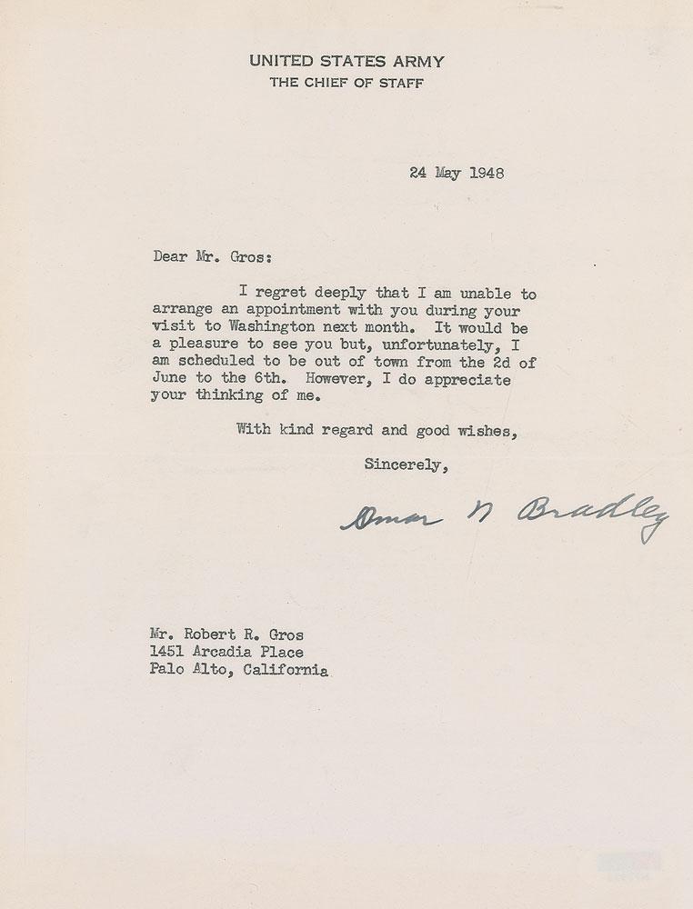 TLS signed "Omar N. Bradley," one page, 7 x 9, United States Army letterhead, May 24, 1948. Letter to Robert R. Gros. In part: "I regret deeply that I am unable to arrange an appointment with you during your visit to Washington next month?I am scheduled to be out of town from the 2d of June to the 6th." In fine condition, with a PSA/DNA label affixed to the reverse. Accompanied by a certificate of authenticity from PSA/DNA and an unsigned photo of Bradley. An interesting association as he mentions June 6, 1948, which was the fourth anniversary of D-Day.