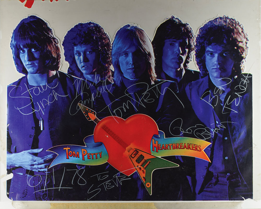 Uncommon color 39.5 x 32.25 store window display poster of Tom Petty and the Heartbreakers originally released to promote their second album, "You're Gonna Get It!," signed in silver ink by Tom Petty, Mike Campbell, Ron Blair, Stan Lynch, and Benmont Tench, with one member adding an inscription and date below, "To Steve, 6/1/78." Rolled and in very good condition, with damage to the left side and to the lower right corner, and a trimmed top edge, all of which could mostly be matted out if so desired.