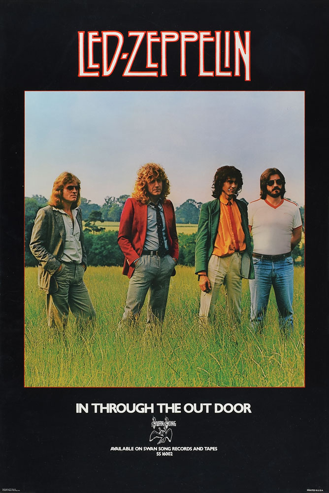 Uncommon circa 1979 color 20 x 30 poster promoting the Swan Song Records release of Led Zeppelin's eighth and final studio album, In Through the Out Door, showing a large, bright image of the band posing together in a field. Rolled and in fine condition.