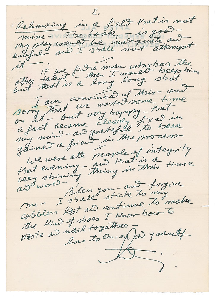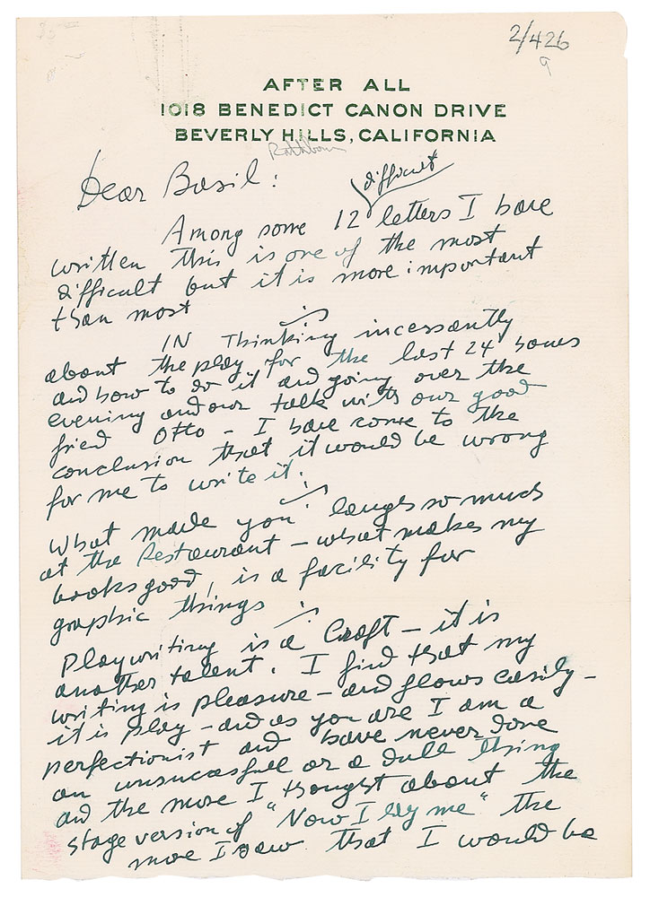 Belgian-born American author and illustrator (1898-1962) best known for his now-classic series of Madeleine children's books. ALS signed “Ludwig,” two pages, 6.75 x 9.5, After All letterhead, no date. Letter to award-winning actor Basil Rathbone, in part: "What made you laugh so much at the restaurant—what makes my books good, is a facility for graphic things. Playwriting is a craft—it is another talent. I find that my writing is pleasure—and flows easily—it is play—and as you are I am a perfectionist and have never done an unsuccessful or a dull thing and the more I thought about the stage version of 'Now I lay me' the more I saw that I would be labouring in a field that is not mine. The book—is good—my play would be inadequate and awful and I shall not attempt it. If we find a man who has the other talent—then I would help him but that is a long long shot. I am convinced of this—and sorry that we wasted some time on it—but very happy—that a fact became clearly fixed in my mind—and grateful to have joined a friend in the process." In fine condition, with staple holes to the upper left corner.