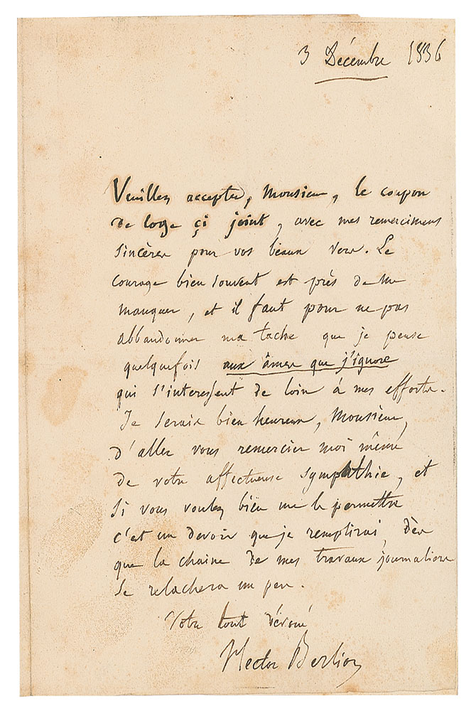 ALS in French, one page, 4.5 x 7, December 3, 1836. In full (translated): "I am enclosing herewith, sir, the ticket for a box seat with my sincere thanks for the beautiful lines you wrote. Quite often courage almost fails me. However, it is reassuring to think that there are good souls whom I do not know who take an interest in my work from afar. This thought keeps me to my task. I should be very happy, sir, to convey my thanks personally for your kind consideration. If you will permit me, it is an obligation that I shall fulfill as soon as the pressures of my daily labors have eased." In very good condition, with scattered light creasing and staining.