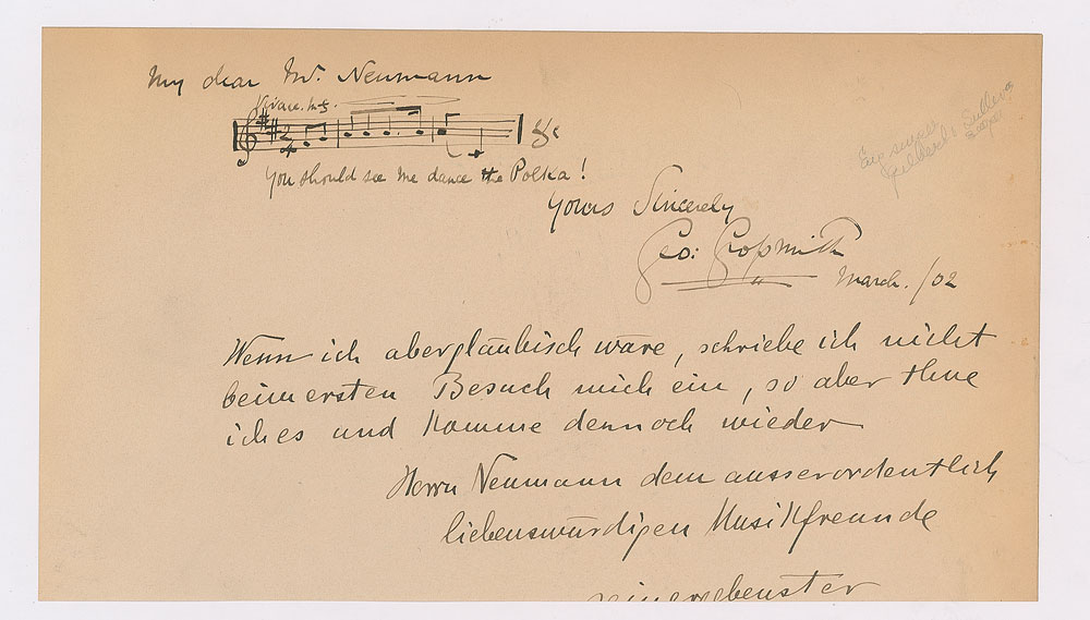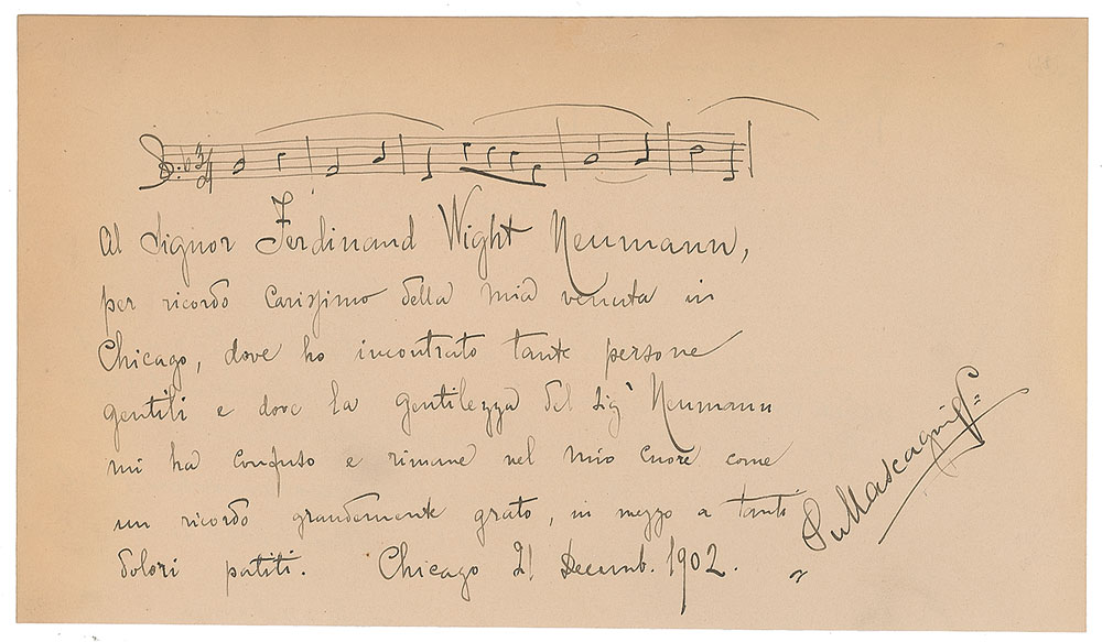 Very appealing AMQS on an off-white 10.5 x 6 sheet, signed below in fountain pen, "P. Mascagni, Chicago 21 Decemb. 1902," who pens four bars of music from the opening melody of his beloved Intermezzo and then writes a lengthy inscription in Italian to German impresario Ferdinand Wight Neumann. Reverse bears an AMQS by George Grossmith, who pens three bars of music from 'See Me Dance the Polka.' In fine condition.