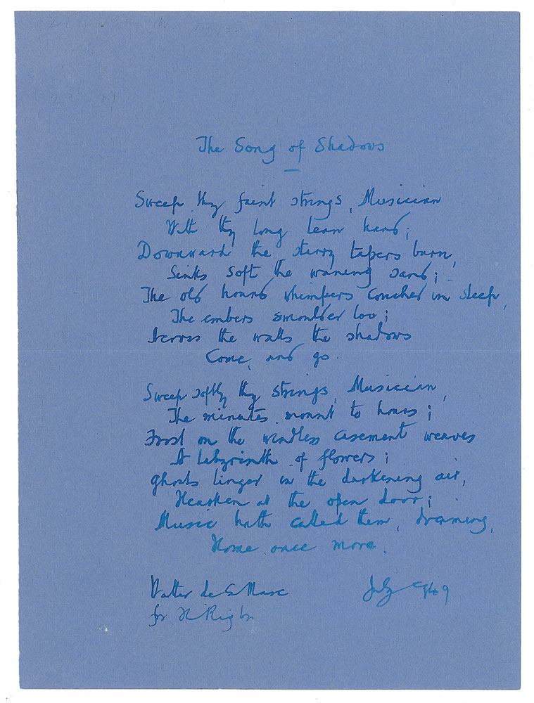 English poet, short story writer and novelist (1873-1956) who is best remembered for his works for children, the poem The Listeners, and for subtle psychological horror stories like 'Seaton's Aunt' and 'All Hallows.' Handwritten poem by Walter de la Mare entitled "The Song of Shadows," penned on a blue 5 x 7 sheet, which is signed and dated below, "Walter de la Mare, July '49." The poem, in full: "Sweep thy faint strings, Musician / With thy long lean hand; / Downward the starry tapers burn, / Sinks soft the waning sand; / The old hound whimpers couched in sleep, / The embers smoulder low; / Across the walls the shadows / Come, and go. / Sweep softly thy strings, Musician, / The minutes mount to hours; / Frost on the windless casement weaves / A labyrinth of flowers; / Ghosts linger in the darkening air, / Hearken at the open door; / Music hath called them, dreaming, / Home once more." In fine condition.
