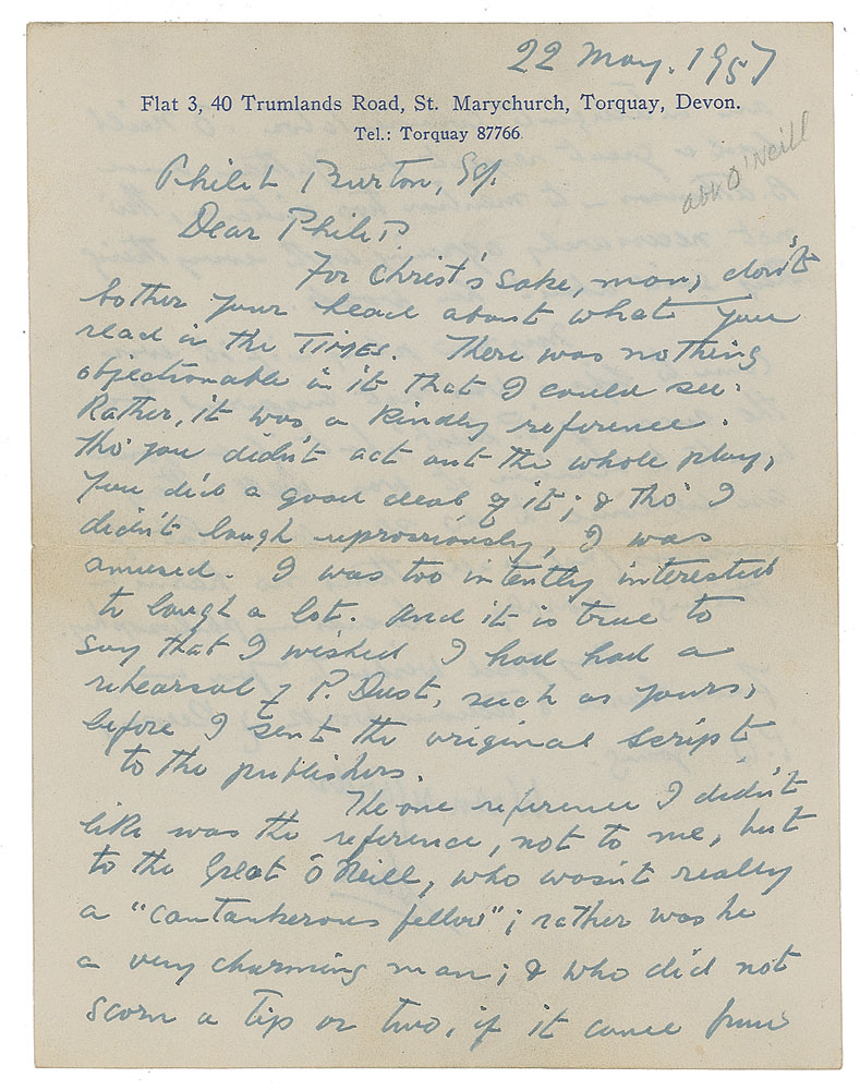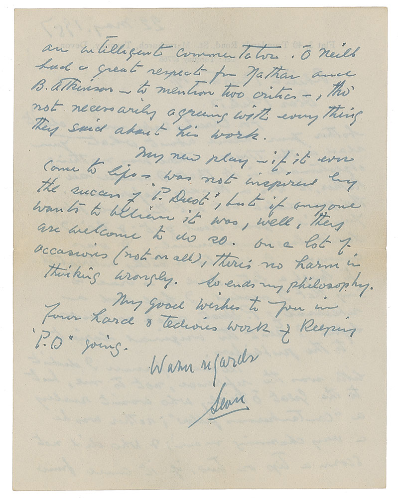 ALS signed “Sean,” one page both sides, 5.5 x 7, 40 Trumlands Road letterhead, May 22, 1957. Letter to Philip Burton, in part: "For Christ's sake, man, don't bother your head about what you read in the Times. There was nothing objectionable in it that I could see. Rather, it was a kindly reference. Tho' you didn't act and the whole play, you did a good deal of it; & tho' I didn't laugh uproariously, I was amused. I was too intently interested to laugh a lot. And it is true to say that I wished I have had a rehearsal of P. Dust, such as yours, before I sent the original script to the publishers. The one reference I didn't like was the reference, not to me, but to the great O'Neill, who wasn't really 'a Cantankerous fellow' neither was he a very charming man; & who did not scorn a tip or two." In fine condition. Accompanied by the original mailing envelope, addressed by O'Casey, who adds his surname and address to reverse flap.