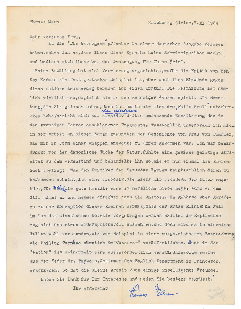 TLS in German, one page, 8.5 x 11, November 7, 1954. Letter to Alice K. Orlan, in part (translated): "Obviously, you have read The Deceived in its original German version. You thus reveal your command of this language which I shall use in responding with gratitude to your letter…In reality, the story of my novel is quite new, despite the fact that it portrays life in the twenties…It is quite correct that I did interrupt my work on the novel to turn to the story of Frau von Tuemmler which had been conveyed to me a short anecdote. I was absorbed by nature's demonic malice that was revealed and I felt a certain spiritual affinity to the topic which I pursued as exhibited in this little volume." In fine condition. Accompanied by an English translation and a copy of Orlan's letter.