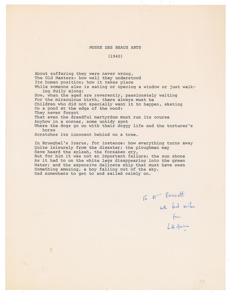 Souvenir typescript of his oft-anthologized poem "Musee des Beaux Arts," one page, 8.5 x 11, signed and inscribed at the conclusion in blue ballpoint, "For Mrs. Prescott, with best wishes from W. H. Auden." In fine condition, with a few tiny stains in the lower blank area. Accompanied by a transmittal letter from Alice M. DeLana at Miss Porter's School, dated February 10, 1971, thanking Mrs. Sherburne Prescott for sponsoring the school's "Prescott Program" of speakers and sending along this autograph.
