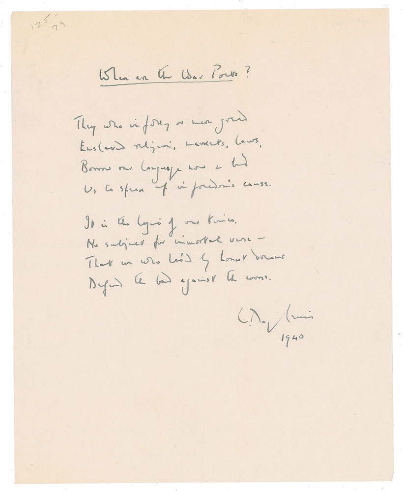 Irish poet (1904-1972) who was the British Poet Laureate from 1968 until his death. Handwritten poem by Cecil Day-Lewis entitled "Where are the War Poets?," penned on an off-white 8 x 10 sheet, signed and dated below, "C. Day-Lewis, 1940." In full: "They who in folly or mere greed / Enslaved religion, markets, laws, / Borrow our language now and bid / Us to speak up in freedom's cause. / It is the logic of our times, / No subject for immortal verse— / That we who liv'd by honest dreams / Defend the bad against the worse." In fine condition.