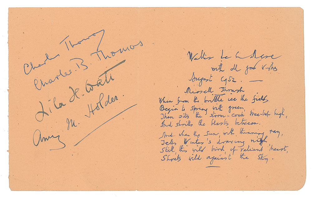 English poet, short story writer and novelist (1873-1956) who is best remembered for his works for children, the poem The Listeners, and for subtle psychological horror stories like 'Seaton's Aunt' and 'All Hallows.' Handwritten poem by Walter de la Mare entitled "Missell Thrush," penned on a pink 7.25 x 4.5 album page, signed at the top by the poet, "Walter de la Mare, with all good wishes, August 1952." The poem begins: "When from the brittle ice the fields, / Begin to spring with green, / Then sits the storm-cock tree-top high, / And shrills the blasts between." The left side of the page bears four additional unknown signatures. In fine condition, with a vertical fold passing through the poem and signature.