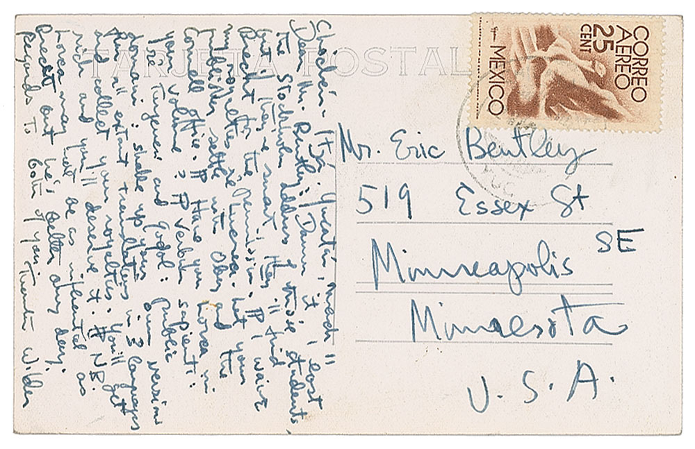 ALS, one page on a 3.5 x 5.5 photo postcard depicting the El Castillo pyramid at Chichen Itza, March 11, [no year]. Letter to critic and arts theorist Eric Bentley, written from "Chichen-Itza, Yucatan," in part: "Damn it. I lost the Stockholm address of those students, but if they're smart they'll find Brecht for the permission. I waive my royalties re: Lucrece. Let your publisher settle with Ober and the Cornell office…re: Turgenev and Gogol: public domain: shake up your own versions from all extant translations…and collect your royalties. You'll get rich and you'll deserve it." In fine condition.