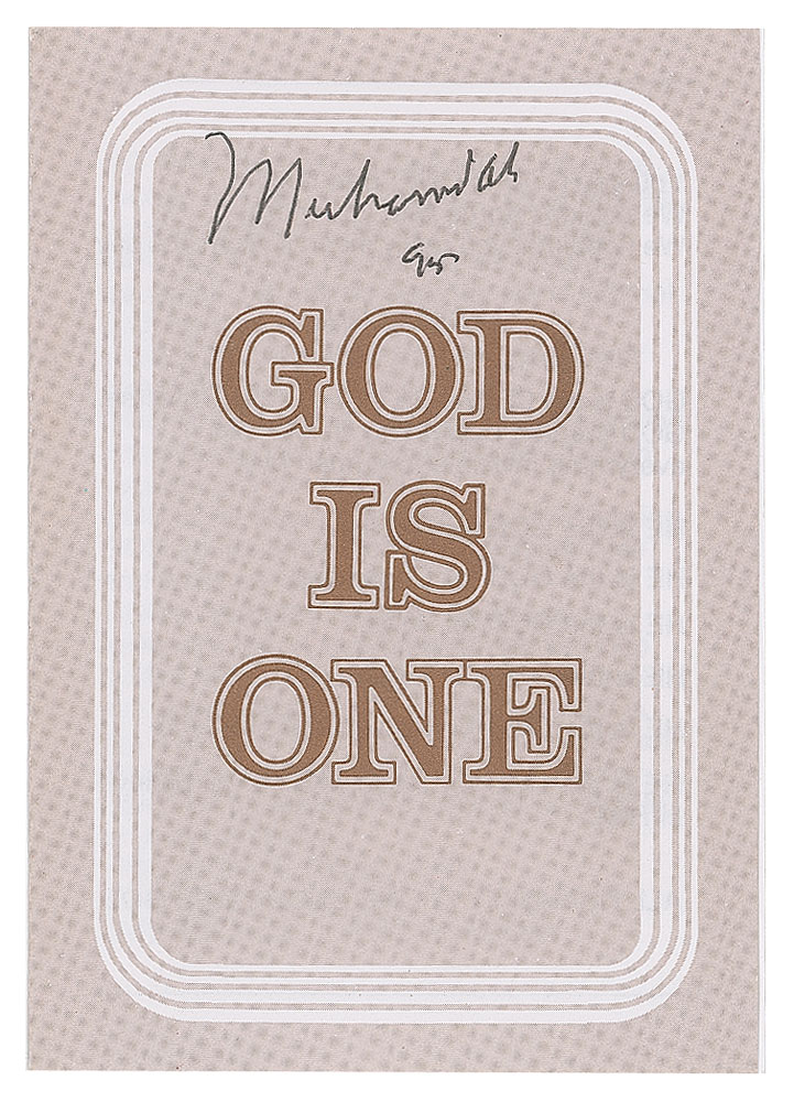 Offered is a Institute of Islamic Institute religious pamphlet signed boldly in black ink "Muhammad Ali" rating a ("9/10"). Ali's fame catapulted after his conversion to Islam, and his legacy was enhanced when the boxing council stripped him of his titles, due to his religious beliefs in his refusal to be drafted to army service. Interesting signed item from arguably the greatest athlete of all time.