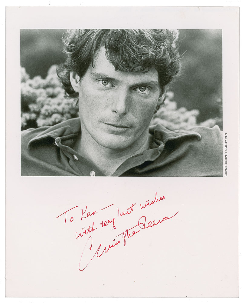 Satin-finish 8 x 10 close-up photo of Reeve staring directly into the camera, signed and inscribed in the wide lower margin in red felt tip, "To Ken—With very best wishes, Christopher Reeve.” Reverse bears a typed collector's notation indicating that it was received in 1989. In fine condition, with a light crease to the lower left blank area.