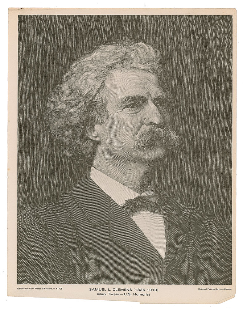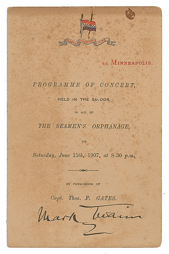 Program for a benefit concert held for "The Seamen's Orphanage" aboard the SS Minneapolis on June 15, 1907, two pages, 4.5 x 7, boldly signed on the front in ink, "Mark Twain." In very good condition, with overall foxing, somewhat irregular toning, and splitting along the hinge. Accompanied by an unsigned portrait. Clemens had embarked for London from New York aboard the SS Minneapolis on June 8, 1907, in order to receive an honorary degree from Oxford University.