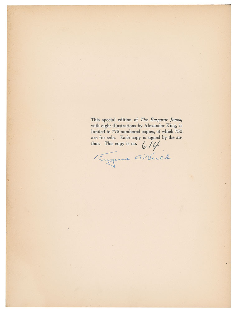Signed book: The Emperor Jones. First edition, limited issue, numbered 614/775. NY: Boni & Liveright, 1928. Hardcover, 7.75 x 10.25, 90 pages. Signed on the colophon in fountain pen by O'Neill. Autographic condition: fine. Book condition: VG/None, with substantial edgewear and a small split at the head of the spine.