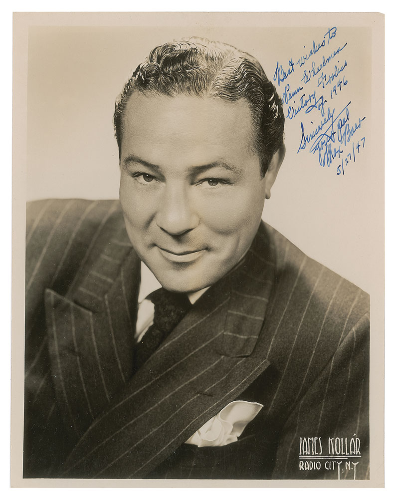 Vintage glossy 8 x 10 studio portrait of the boxer by James Kollar, signed and inscribed in fountain pen, "Best wishes to Penn Wheelmen, Victory Frolics of 1946, Sincerely, your pal, Max Baer, 5/27/47.” In very good to fine condition, with scattered light crazing to the emulsion. Accompanied by a full letter of authenticity from JSA.