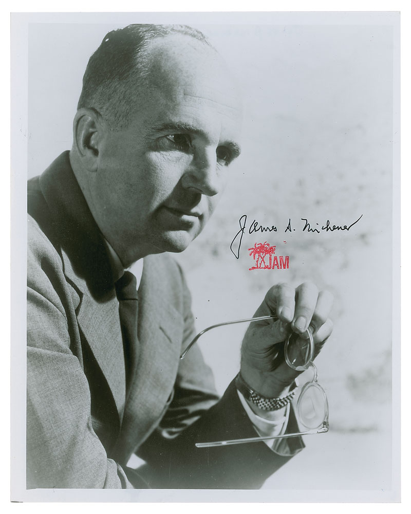 American author of frequent bestsellers (1907-1997) best known for Tales of the South Pacific, Hawaii, The Drifters, The Fires of Spring, Alaska, and others. Glossy 8 x 10 photo of Michener thoughtfully holding his glasses, signed in black felt tip, "James A. Michener," with his red chop stamp below. In fine condition.