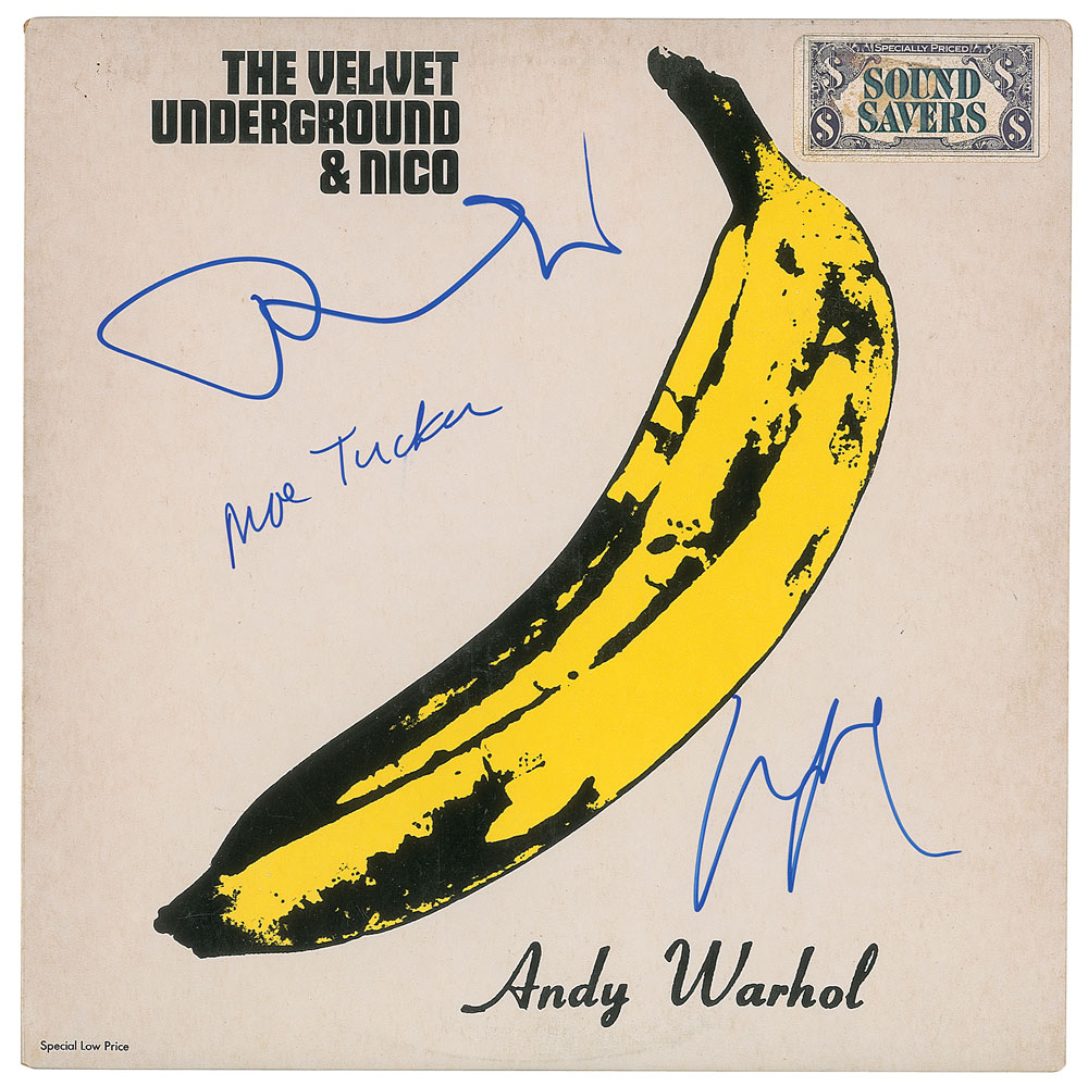 The Velvet Underground & Nico album signed on the front cover in blue felt tip by by Lou Reed, Moe Tucker, and John Cale. In fine condition. The record is included. From The John Brennan In-person Autograph Collection.
