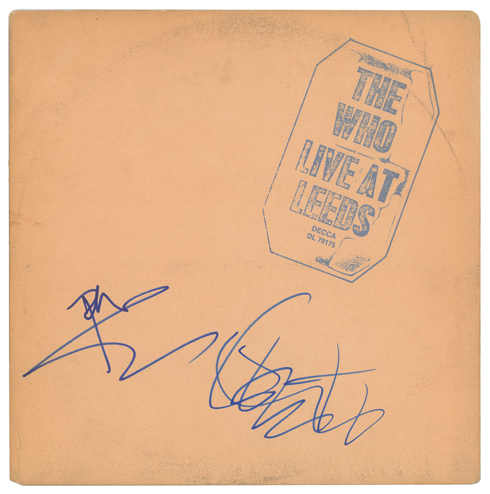 The Who: Live at Leeds album signed on the front cover in blue felt tip by Pete Townshend and Roger Daltrey. In fine condition, with light scuffing. The record is included, as are the posters and facsimile paperwork, which features a copy of the contract for the Who to play at the Woodstock Festival, an insert packaged with the first 500 copies From The John Brennan In-person Autograph Collection.