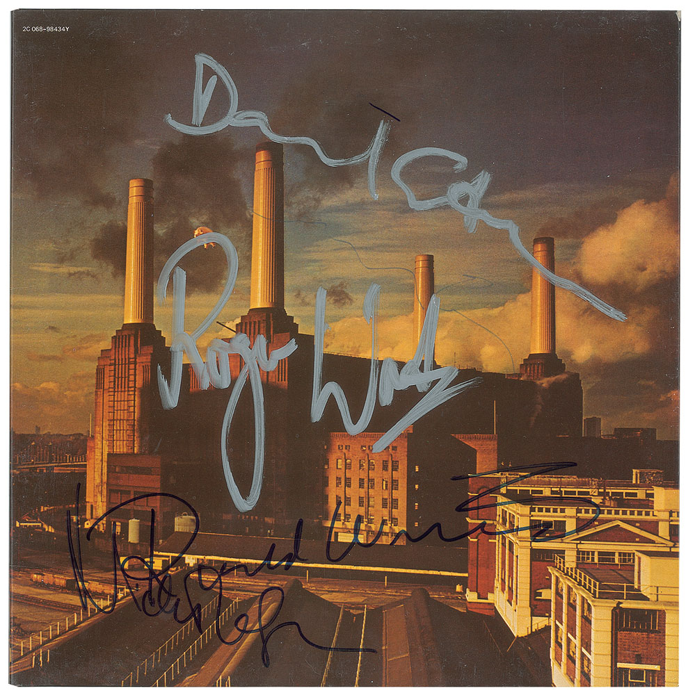 Scarce Animals album signed on the front cover in silver ink by David Gilmour and Roger Waters, and in blue felt tip by Nick Mason and Richard Wright. In fine condition, with a failed first attempt by Gilmour in ballpoint beneath his successful silver signature. The record is included.