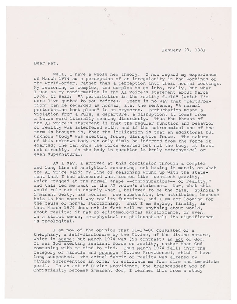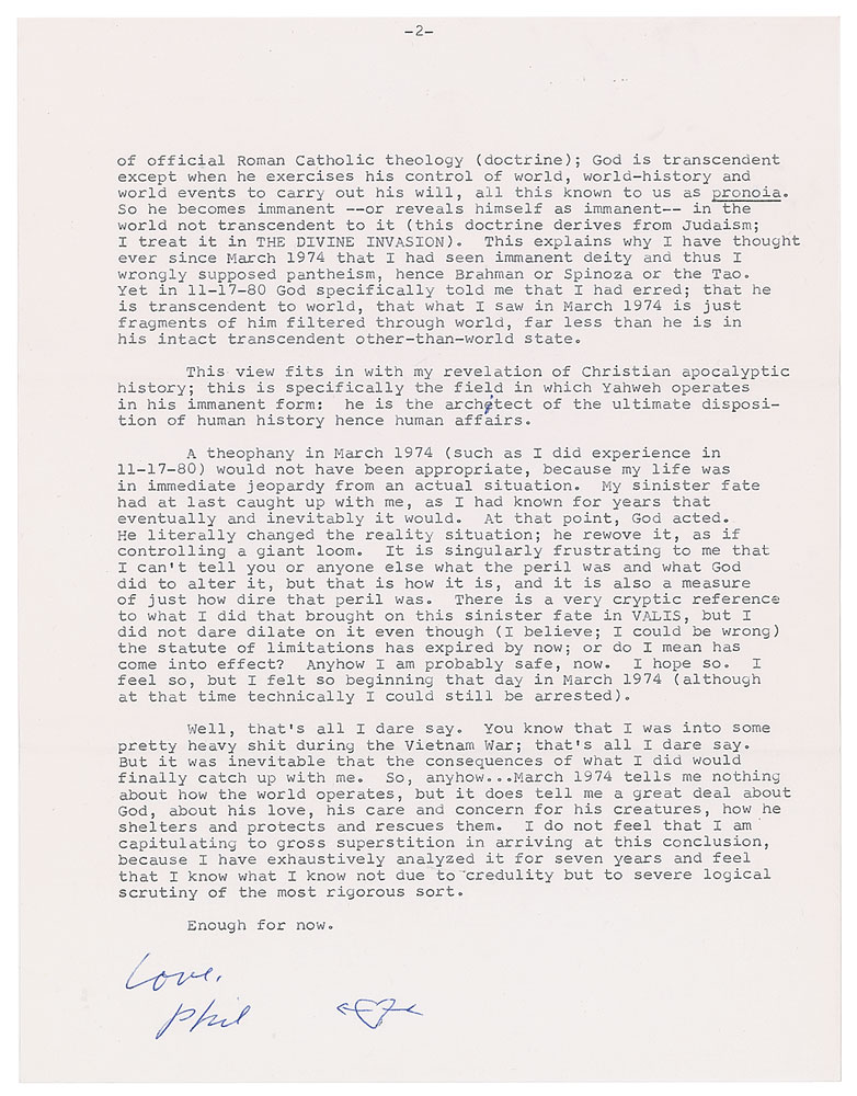 American writer (1928-1982) known for his works of science fiction, including The Man in the High Castle, Do Androids Dream of Electric Sheep?, Ubik, and A Scanner Darkly; acclaimed film adaptations of his works include Blade Runner, Total Recall, and Minority Report. TLS signed “Love, Phil" with added heart and arrow, two pages, 8.5 x 11, January 23, 1981. In-depth letter to science fiction author Patricia Warrick, in which Dick begins expounding on a "March 1974" experience as it relates to reality and "the workings of the new world-order," a moment of which he concludes as "theological." He continues: "I am now of the opinion that 11-17-80 consisted of a theophany, a self-disclosure by the Divine, of the divine nature, which is agape; but March 1974 was (in contrast) an act of God. It was God exerting sentient force on reality, rather than God communing with me mind to mind. Thus March 1974 falls into the category of miracle and pronoia (Divine Providence), which I have long suspected. The actual fabric of reality was altered by divine intervention in order to extricate me from dire and immediate peril. In an act of Divine Providence, the transcendent God of Christianity becomes immanent God; I learned this from a study of official Roman Catholic theology (doctrine); God is transcendent except when he exercises his control of world, world-history and world events to carry out his will, all this known to us as pronoia. So he becomes immanent—or reveals himself as immanent—in the world not transcendent to it (this doctrine derives from Judaism; I treat it in The Divine Invasion). This explains why I have thought ever since March 1974 that I had seen immanent deity and thus I wrongly supposed pantheism, hence Brahman or Spinoza or the Tao. Yet in 11-17-80 God specifically told me that I had erred; that he is transcendent to world, that what I saw in March 1974 is just fragments of him filtered through world, far less than he is in his intact transcendent other-than-world state. This view fits in with my revelation of Christian apocalyptic history; this is specifically the field in which Yahweh operates in his immanent form; he is the architect of the ultimate disposition of human history hence human affairs." In fine condition. Accompanied by the original mailing envelope.