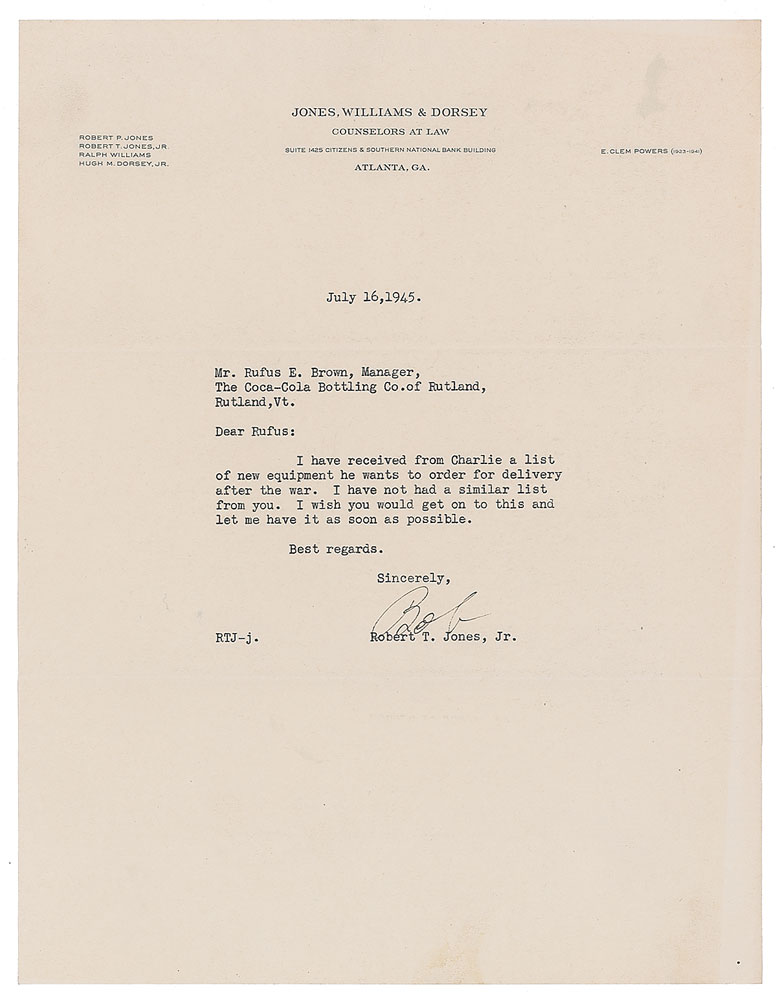 TLS signed “Bob,” one page, 8.5 x 11, Jones, Williams & Dorsey law firm letterhead, July 16, 1945. Letter to Rufus E. Brown, manager of the Coca-Cola Bottling Co. of Rutland, Vermont, in full: "I have received from Charlie a list of new equipment he wants to order for delivery after the war. I have not had a similar list from you. I wish you would get on to this and let me have it as soon as possible." In fine condition. Accompanied by a full letter of authenticity from PSA/DNA.