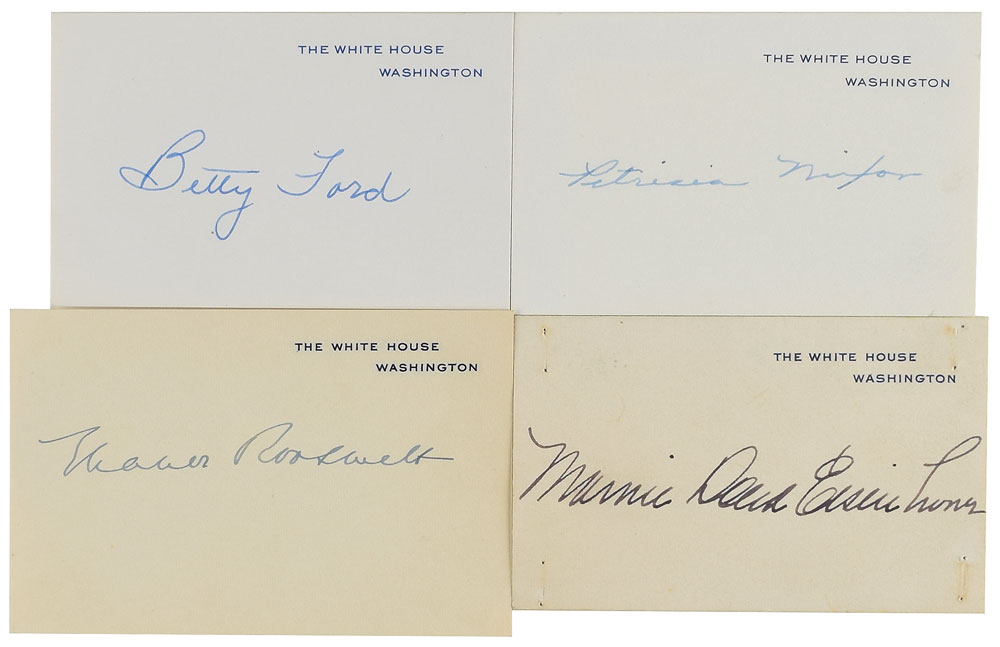 Group of four White House cards signed in ink by first ladies, including Eleanor Roosevelt, Mamie Doud Eisenhower, Patricia Nixon, and Betty Ford. In fine condition, with small mounting remnants on the back of the Roosevelt card and rusty staple holes to the Eisenhower card. Accompanied by the transmittal letter for the Ford card and original mailing envelope panel for the Eisenhower card.