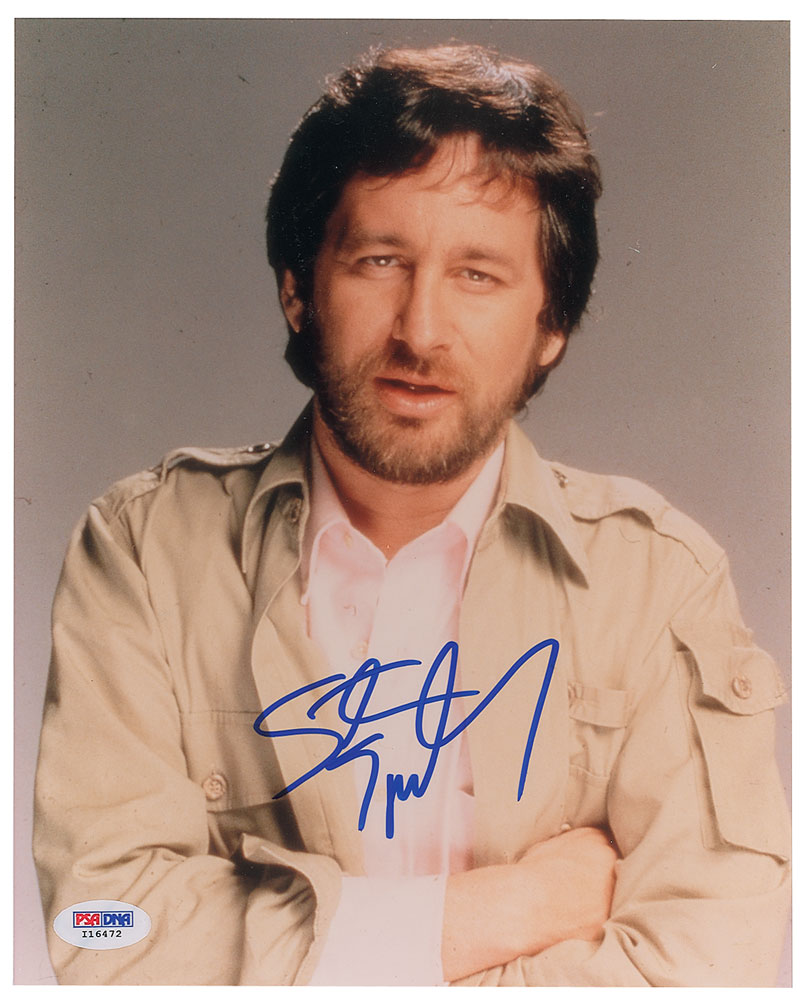 Color glossy 8 x 10 photo of Spielberg in a khaki jacket, signed in blue felt tip. In fine condition, with a PSA/DNA label affixed to the lower left. Accompanied by a certificate of authenticity from PSA/DNA.