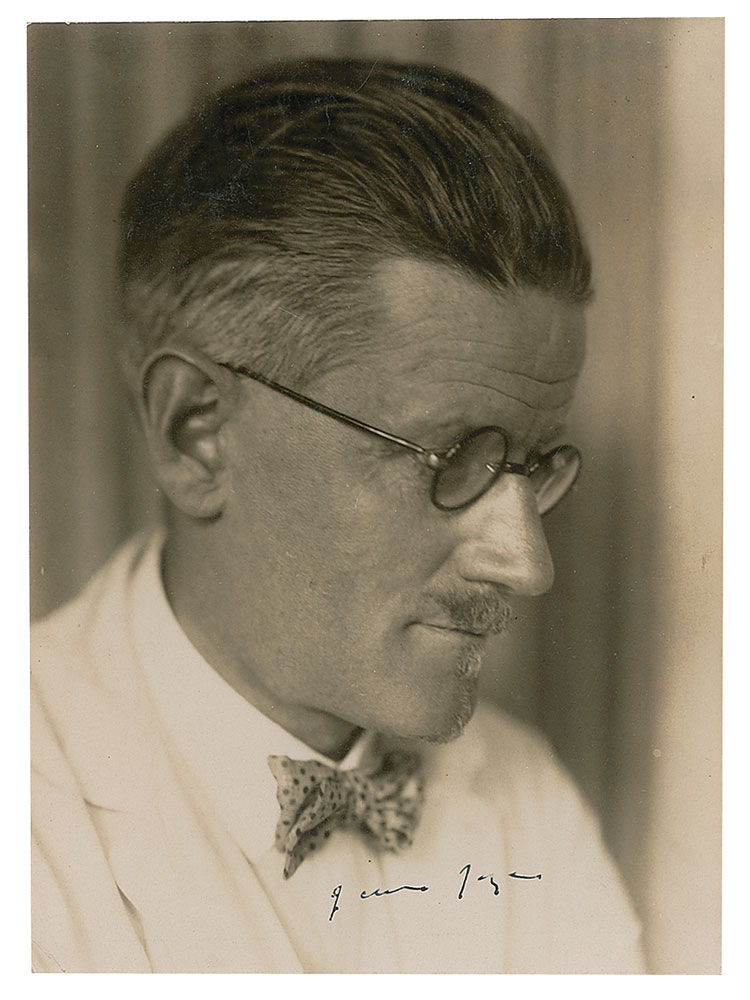 Amazing and exceedingly rare vintage glossy 6.5 x 9 close-up photo of Joyce wearing his polka-dot bow tie and round spectacles, neatly signed in fountain pen, "James Joyce." Reverse bears an "Atelier Ruth Asch" credit stamp. In fine condition, with light silvering to darker areas of the image. This magnificent portrait is believed to have been produced in 1929 by Ruth Asch, likely at the request of the publisher Rhein-Verlag; one of the images in her series of Joyce portraits would be used to advertise the original German edition of Ulysses in 1930. An absolutely spectacular 'fadograph' that perfectly captures the revered Irish author, whose innovative prose forever revolutionized the written word.